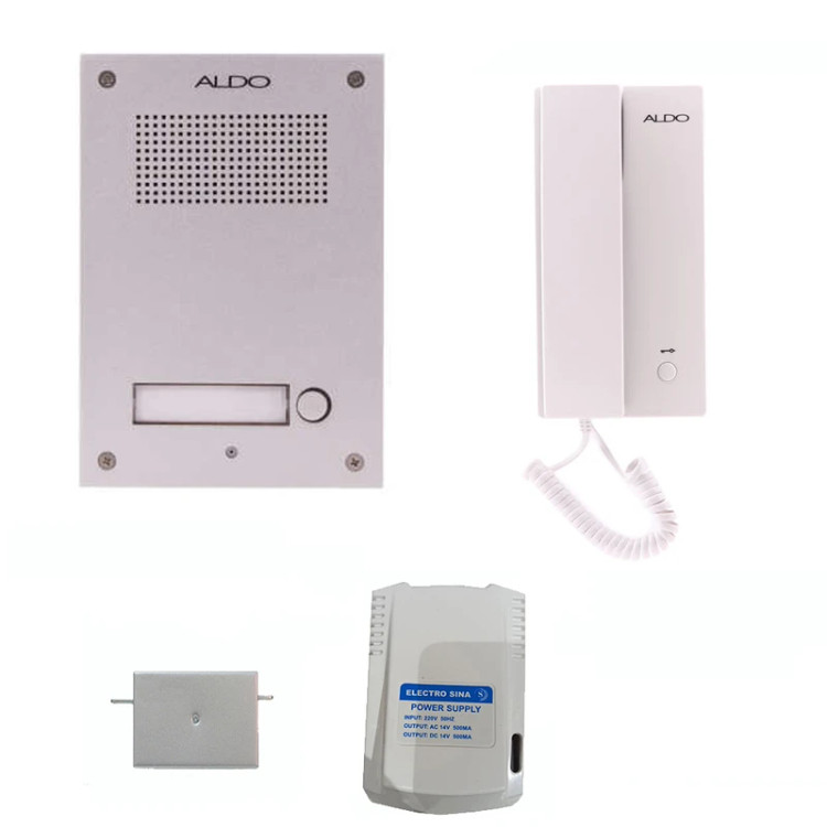 پکیج کامل آیفون صوتی آلدو یک واحدی با پنل یکپارچه آلومنیومی و صدای قدرتمند فراگیر ساخته و عرضه شده است. این مجموعه شامل گوشی پنل و ترانس 14 ولت و قفل زنجیری است.