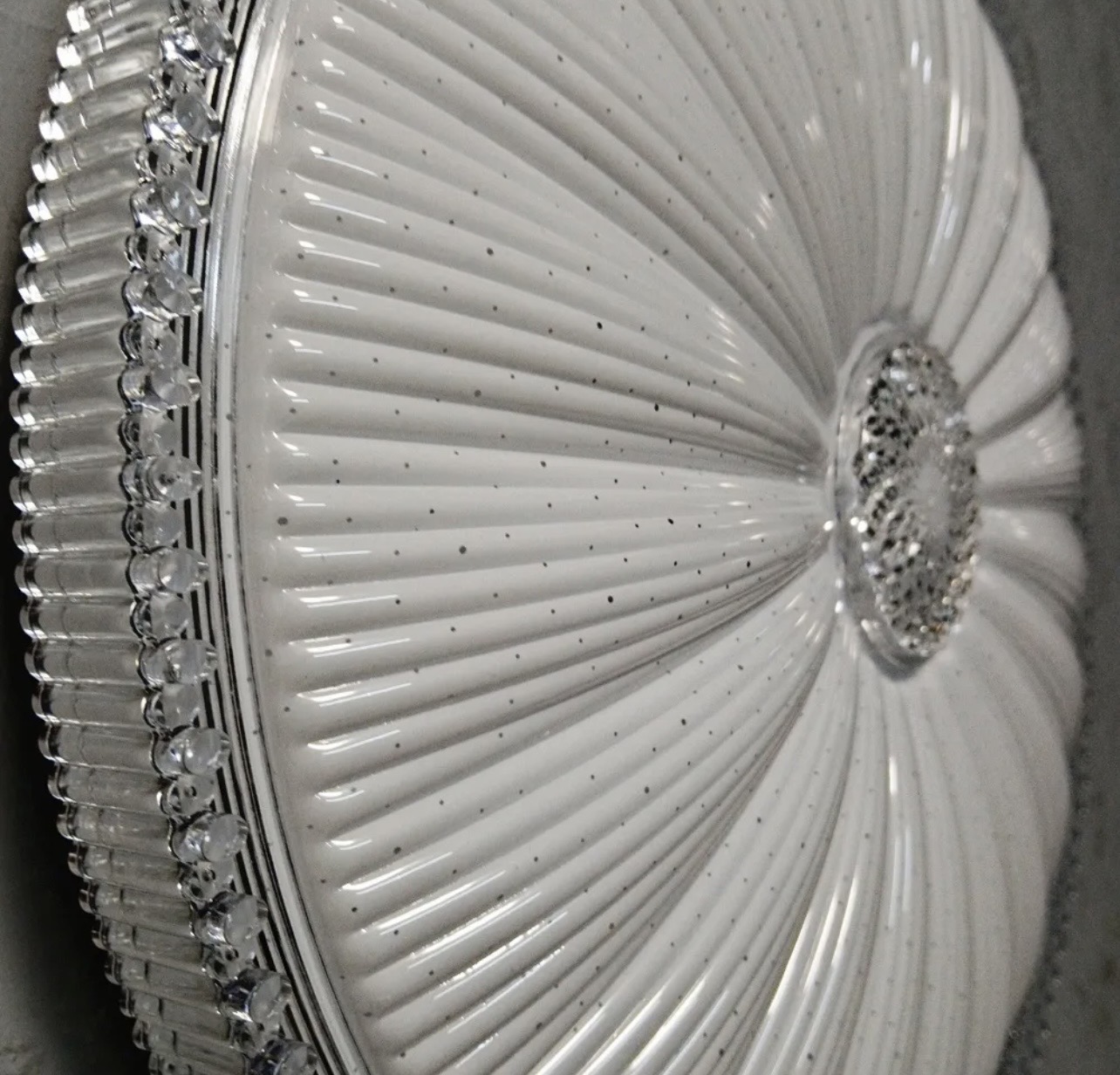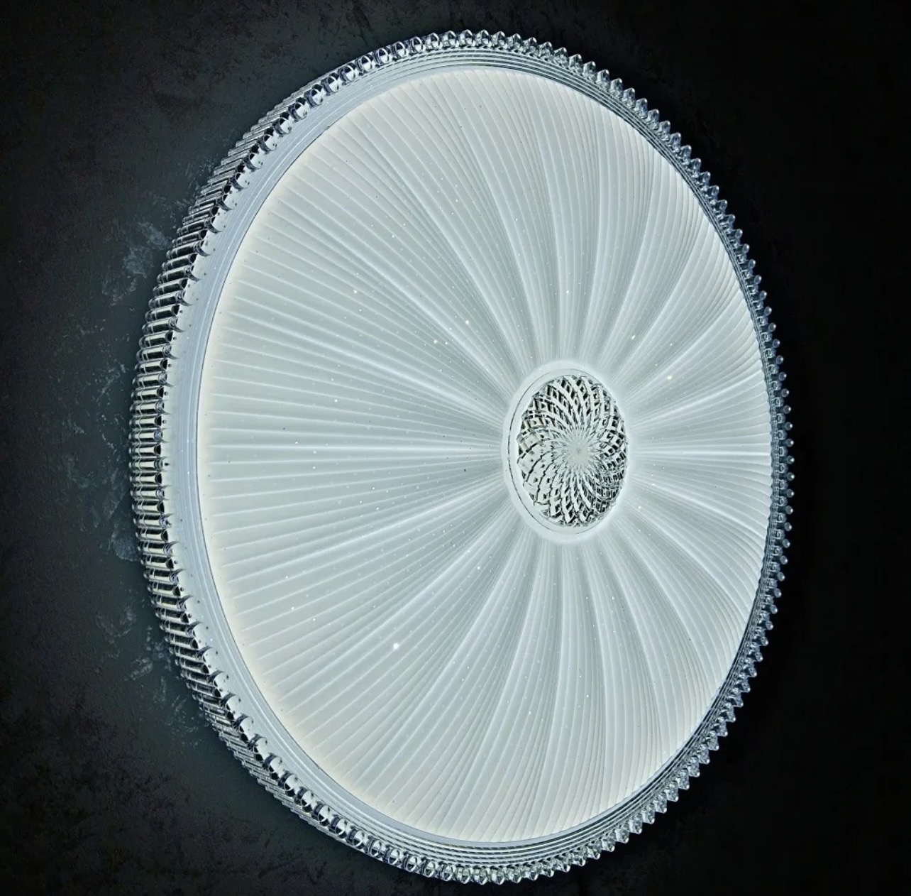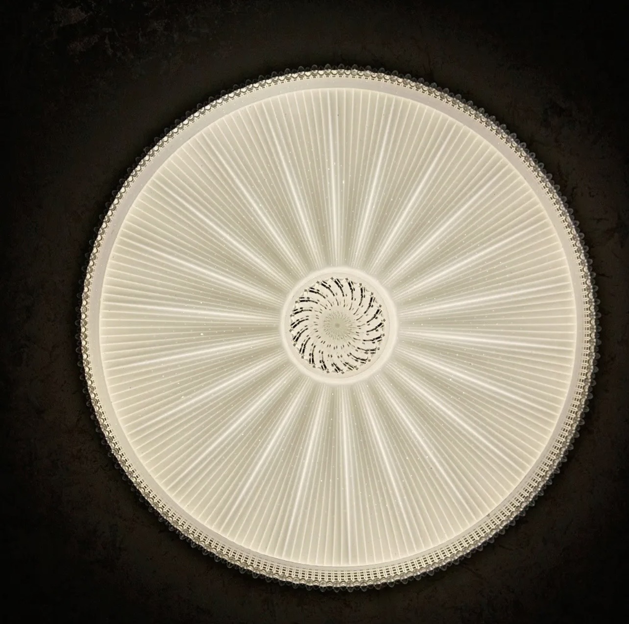 طراحی شعاعی همراه با لایه کریستالی براق، جلوهای لوکس و چشمنواز به سقف میبخشد.